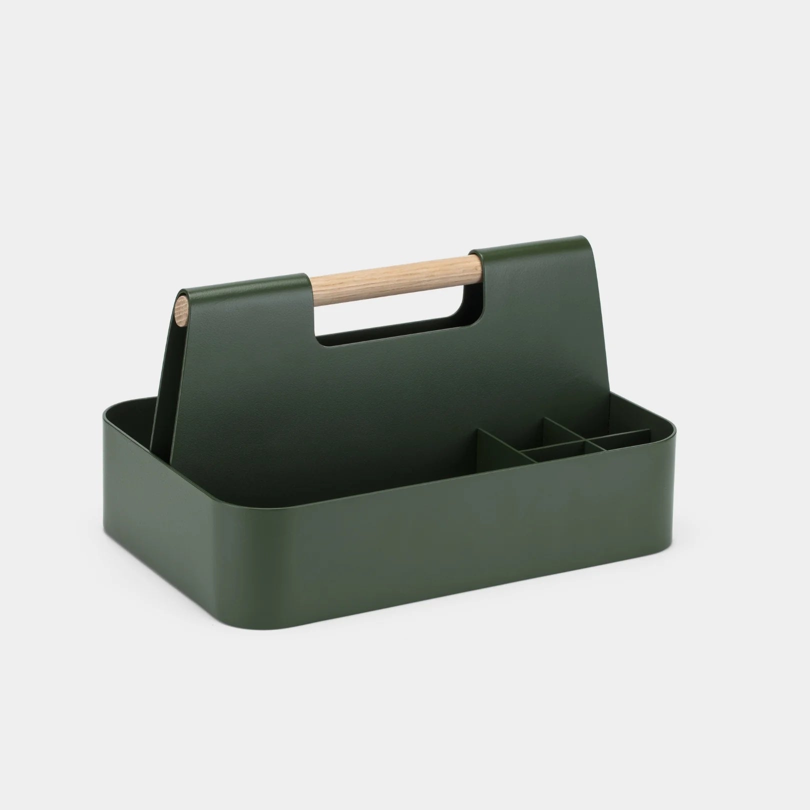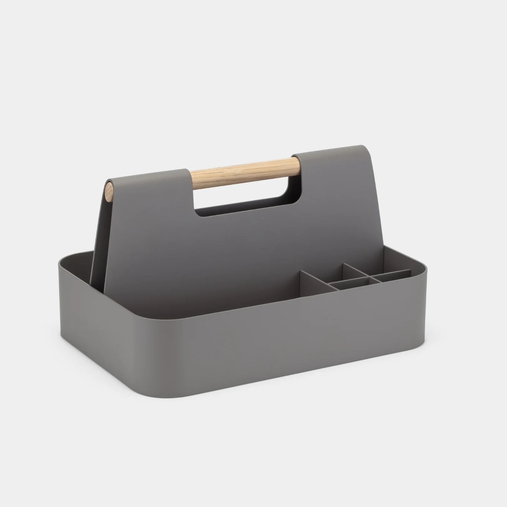 The Desk Caddy features powder coated aluminum with integrated compartment dividers and a solid wood handle to create stylish, functional storage for items big and small. Curated by Branch and designed by our friends at Most Modest.